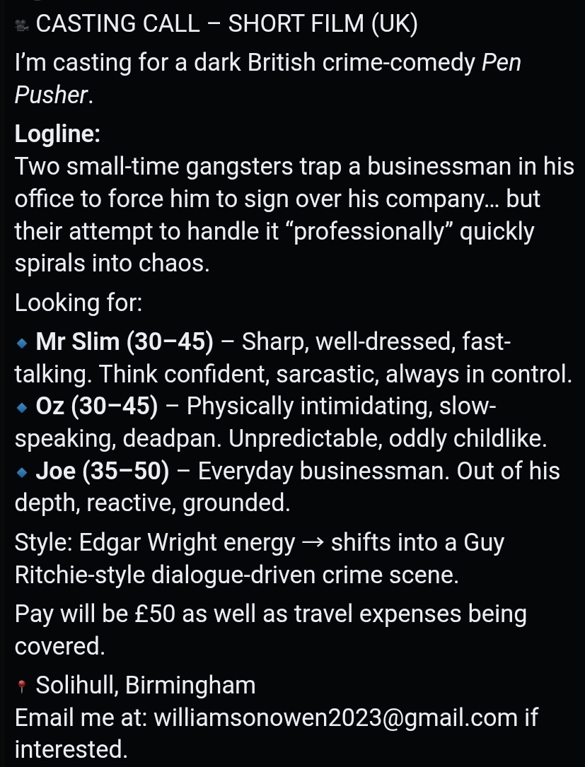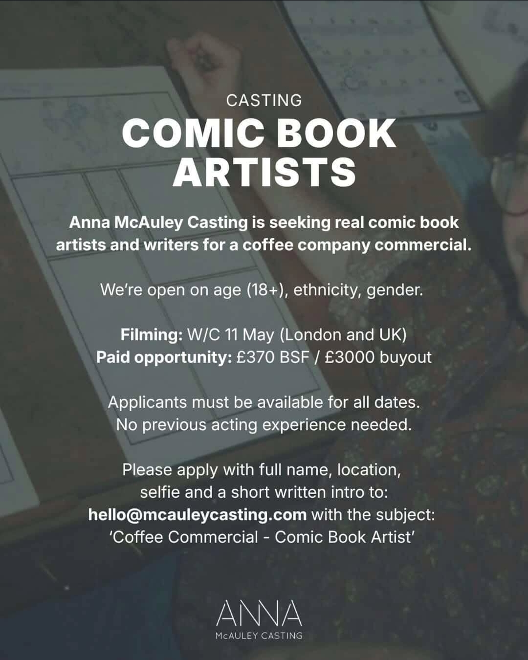 If you do see any castings on social media that we haven’t listed, please help your fellow artists by sending them to us so we can list them. (They must have email addresses to apply to)