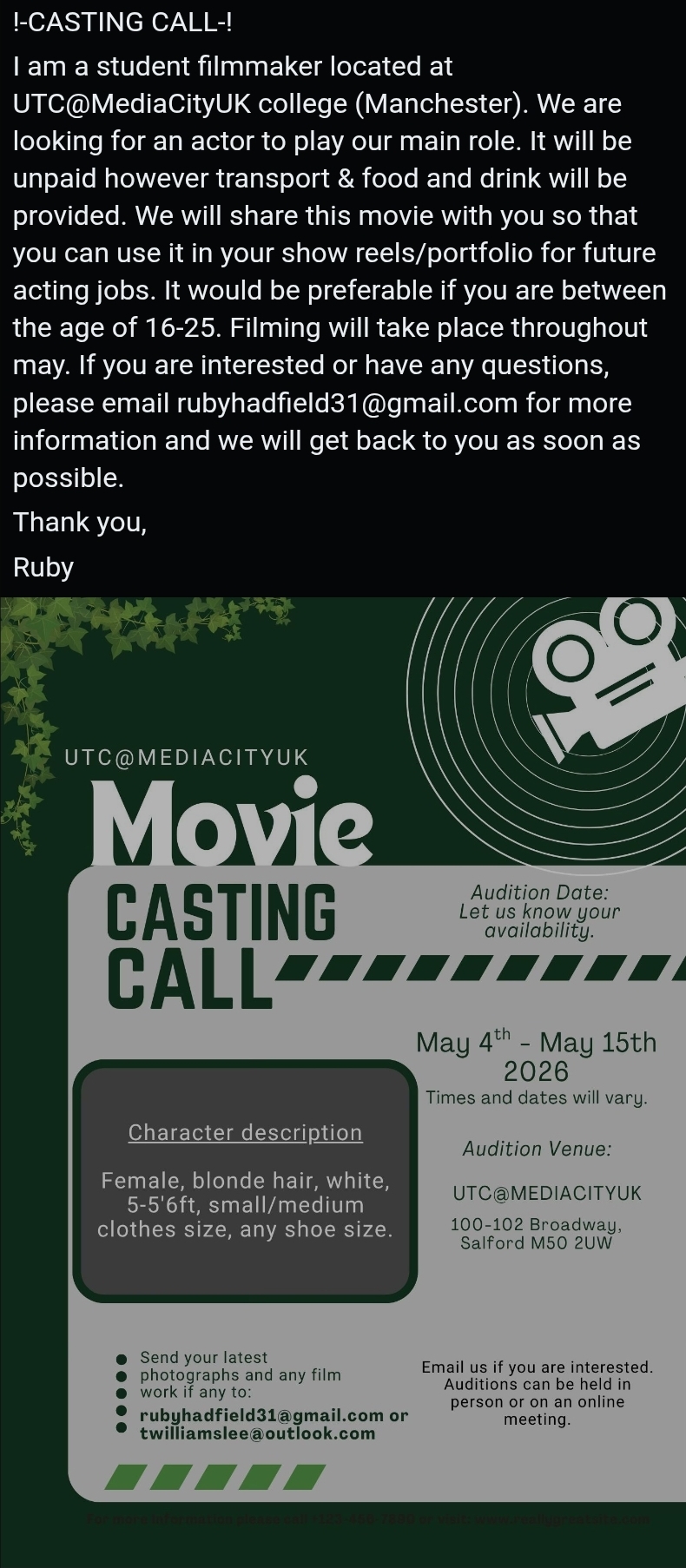 Aside from the castings that will come in via your notifications from Casting Directors, these are castings that we find around social media. We have put them below and have made it easy for you to apply for them. This is to save you lovely bunch from having to search around social media all day for castings.
