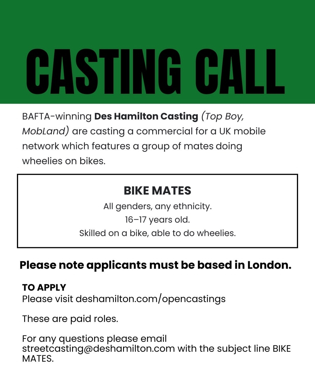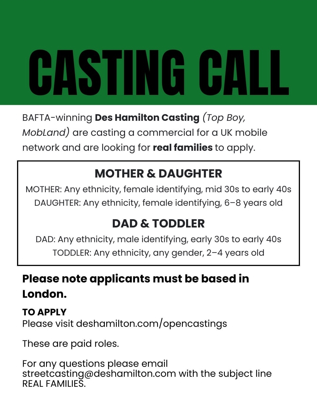 Aside from the castings that will come in via your notifications from Casting Directors, these are castings that we find around social media. We have put them below and have made it easy for you to apply for them. This is to save you lovely bunch from having to search around social media all day for castings.